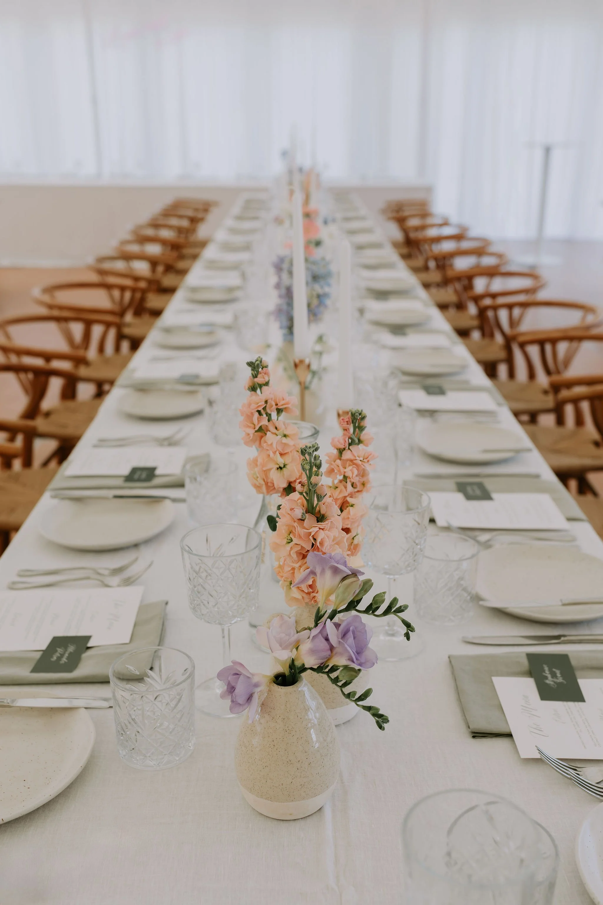 Included in your venue hire are extra wide walnut trestle tables and mix-matched timber chairs, all styled to complement the rustic interior.